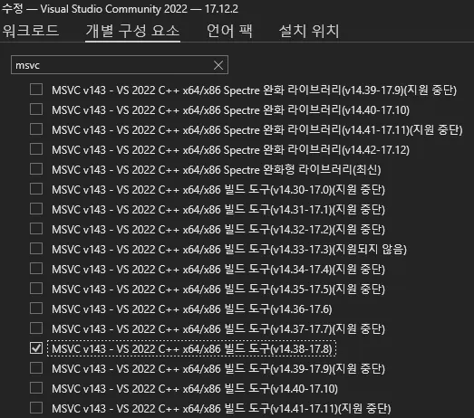 Visual Studio 설치 관리자에서 수정 버튼을 누른 후 개별 구성 요소 탭을 들어간다. 그 후 msvc를 검색하면 여러 버전의 msvc 목록이 나오는데 14.38.33130 버전을 포함하는 것을 고른 후 수정 버튼을 눌러 다운 받는다.