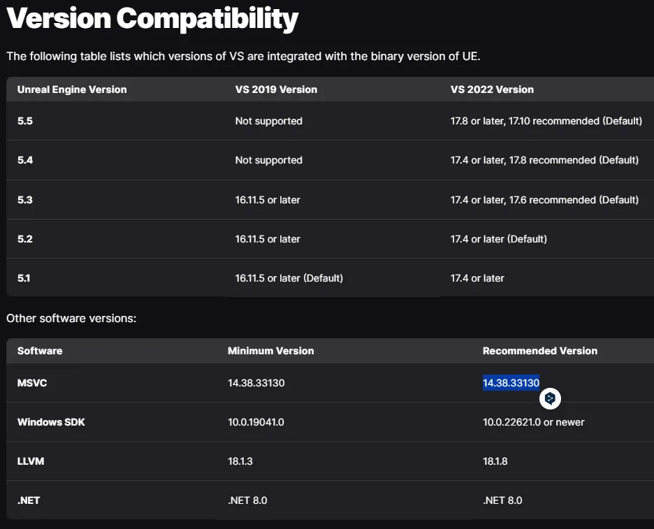 언리얼 엔진을 처음 사용하다 보니 개발 환경을 설정하는 것에서 문제가 계속 터진다. 블루프린트만 사용하다가 C++을 사용해보려고 했는데 Editor 빌드에서 계속 실패했다. 반나절 정도 씨름하다가 알게된 원인은 MSVC 버전 문제였다. 현재 언리얼 엔진 5.0.3, Visual studio 2022를 사용 중이다. Visual studio를 설치할 때 최신 버전의 빌드 도구를 설치했는데 최신 버전은 호환되지 않는 것 같다. 언리얼 엔진 공식 문서를 확인해보면 MSVC 권장 버전은 14.38.33130이다.