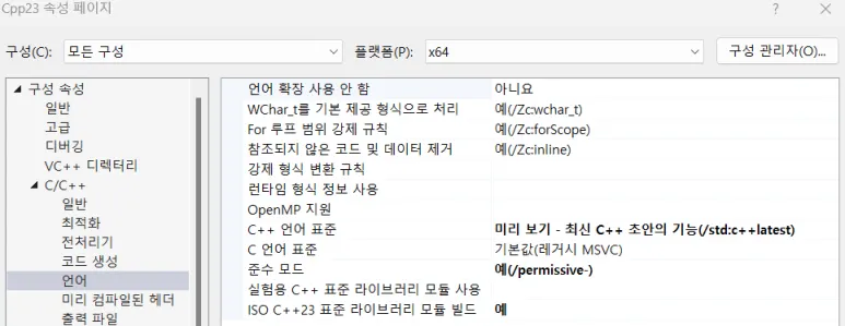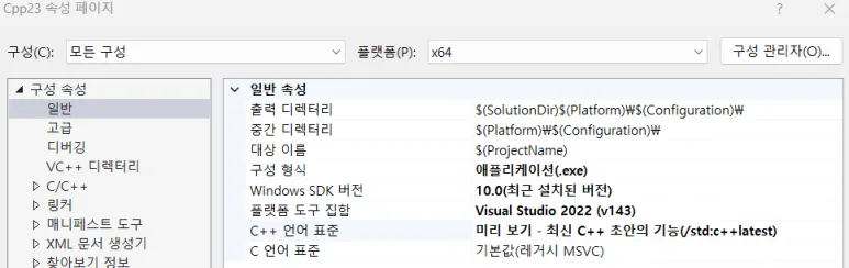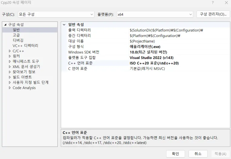 프로젝트 속성 > 일반 > C++ 언어 표준: ISO C++20 표준 (/std:c++20)