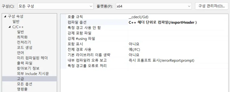 C/C++ > 고급 > 컴파일 옵션: C++ 헤더 단위로 컴파일(/exportHeader )